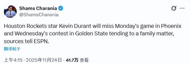 北京时间11月24日,据名记Shams报道,火箭球星凯文-杜兰特将因处理家庭事务缺席接下来两场比赛。