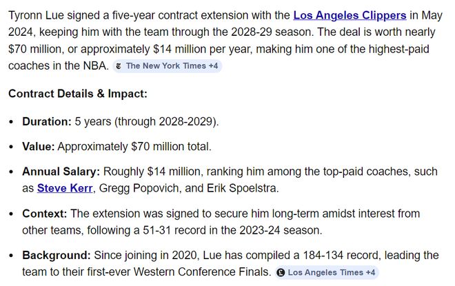 泰伦卢在2024年5月与快船达成了一份续约合同价值五年7000万,均薪高达1400万,这让他成为NBA历史最高薪的教头之一,比肩科尔、波波维奇、斯波尔斯特拉等人。