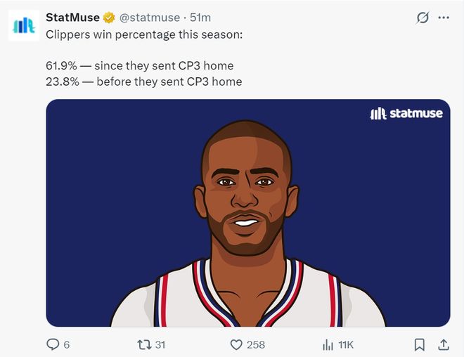 此役后数据媒体晒出一组数据,保罗离开LAC前胜率23.8%,而保罗离开快船后LAC胜率高达61.9%,从这项数据来看保罗的确是快船的负累。